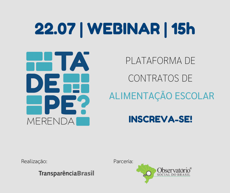 Nesta quarta-feira (22/07), às 15 horas, a Transparência Brasil realiza o webinar de lançamento da plataforma Tá de Pé Merenda. A ferramenta reúne informações de licitações e contratos de alimentação escolar por município, possibilitando seu acompanhamento e monitoramento pelos atores engajados no controle social de políticas públicas.