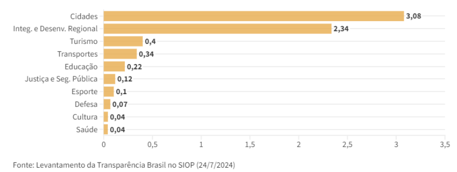 As emendas têm baixa conexão com as áreas às quais as comissões de origem se dedicam. Dados mostrados na nota técnica mostram que os maiores volumes de empenhos (reservas de recursos para execução) estão em ministérios com atuação direta em municípios, como Cidades e Integração e Desenvolvimento Regional.