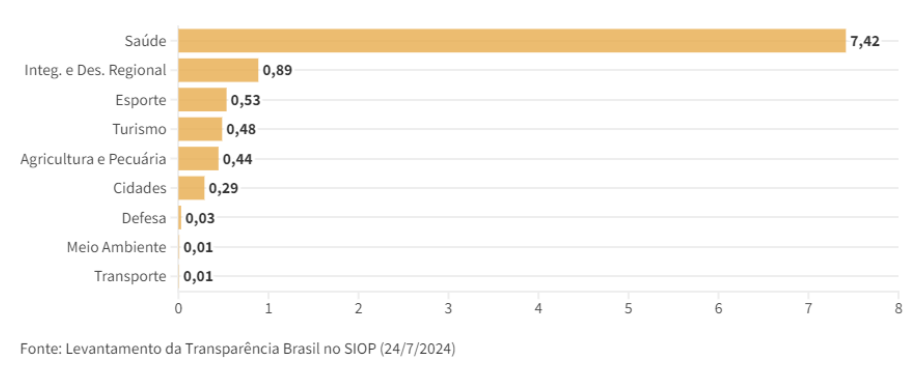 Os valores destinados por meio das emendas Pix passaram de R$ 3 bilhões em 2022 para R$ 7 bilhões em 2023. O total reservado para elas em 2024 é de R$ 8 bilhões. As emendas apresentam um baixo grau de transparência sobre a destinação e aplicação, além de dificultar o acompanhamento do gasto pela sociedade e por órgãos de controle.