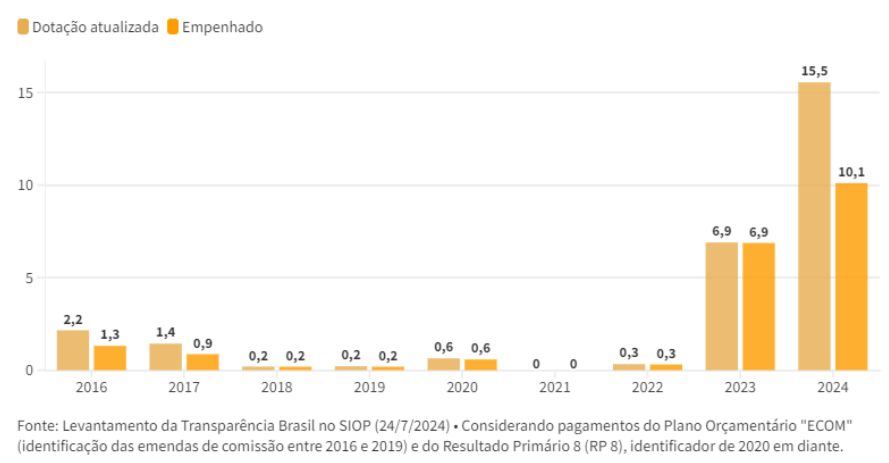 As emendas de comissão, por sua vez, foram incrementadas por meio da Emenda Constitucional nº 126/2022 (resultante da PEC da Transição) e continuaram a crescer em 2024. A nota técnica aponta que, no momento em que são aprovadas, as emendas de comissão de 2023 e 2024 foram destinadas a ações orçamentárias genéricas, o que também as torna incompatíveis com o art. 166, §3º, I da Constituição.
