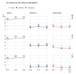 O uso das indenizações como forma de driblar o teto constitucional fica mais evidente diante do fato de que, em 2018, quando o salário médio dos membros passou de R$ 28 mil para R$ 33 mil, houve uma diminuição considerável nos gastos com indenizações dos três órgãos.
