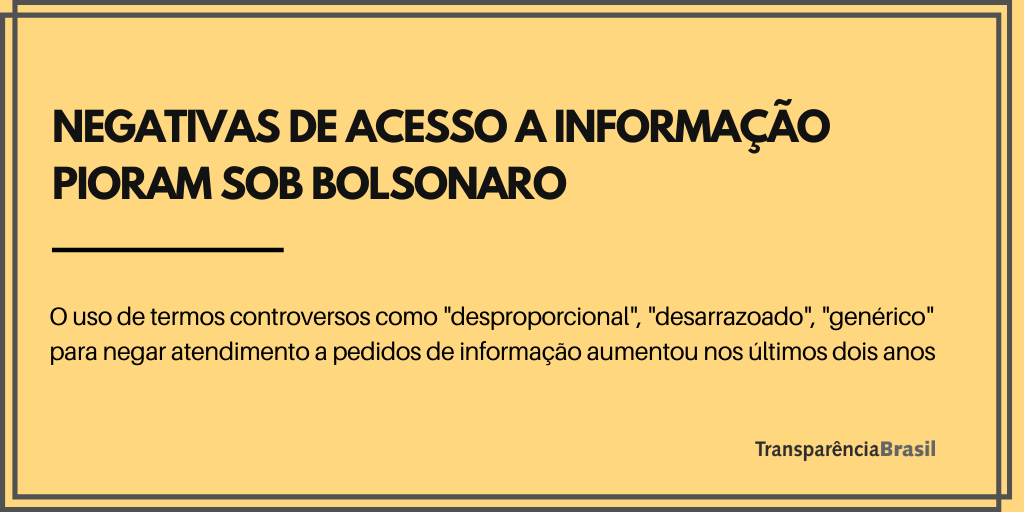 Relatório divulgado na íntegra nesta segunda-feira (3) pela Transparência Brasil mostra que o uso de justificativas controversas pelo Executivo federal para negar atendimento a pedidos feitos via Lei de Acesso a Informação aumentou em até 4 vezes no governo Bolsonaro. De janeiro de 2019 a junho de 2020, o uso dos termos “trabalho adicional”, “fishing”, “desproporcional”, “desarrazoado” e “pedido genérico” chegou a estar presente em 40% do total de negativas emitidas pelo Executivo federal. Os resultados foram adiantados neste domingo (2) na Folha de S.Paulo.